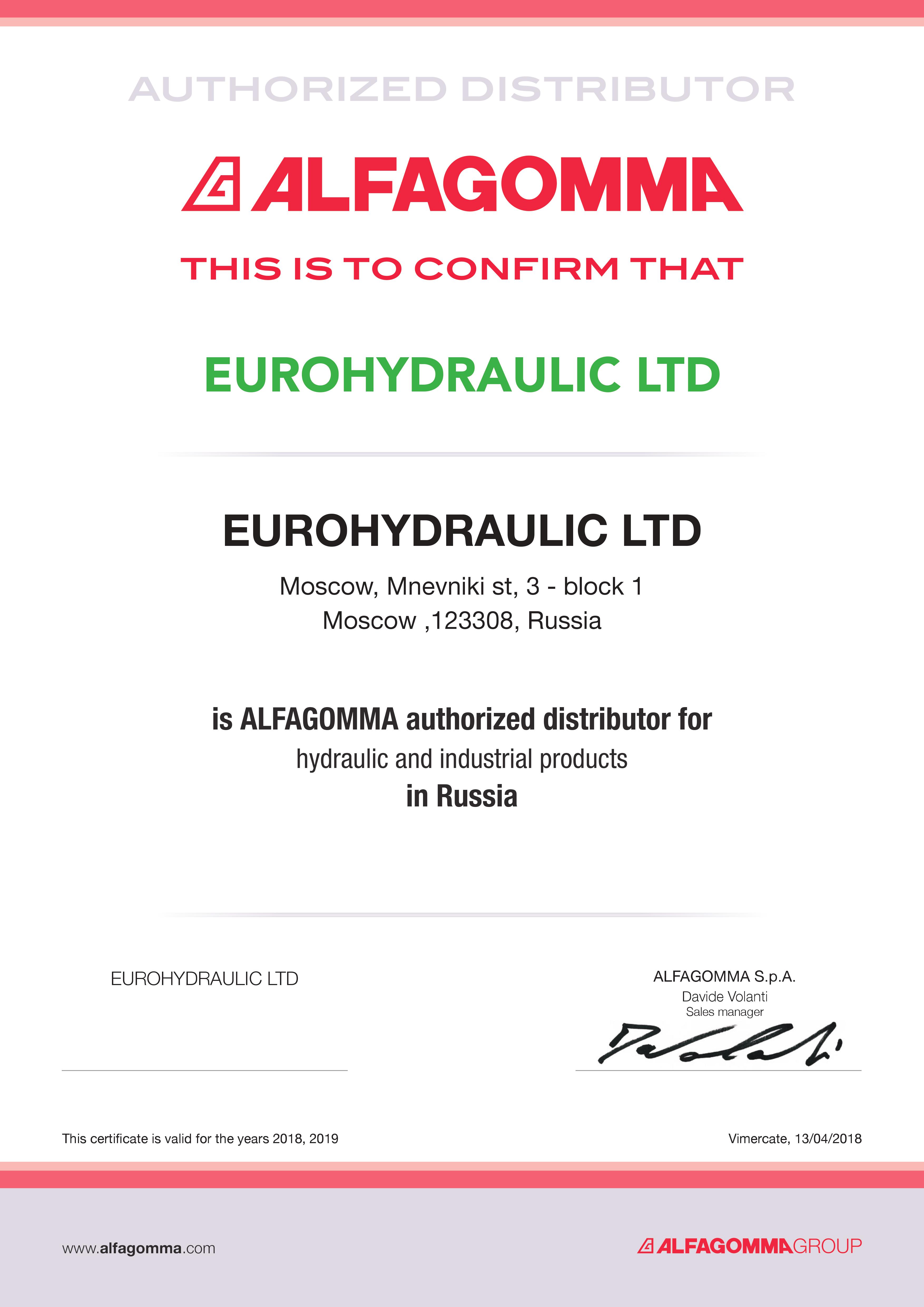 Данный сертификат выдан компании «Еврогидравлик» компанией «Alfagomma», подтверждающий, что все товары бренда поставляются напрямую и гарантируют качество производителя в полном объеме.