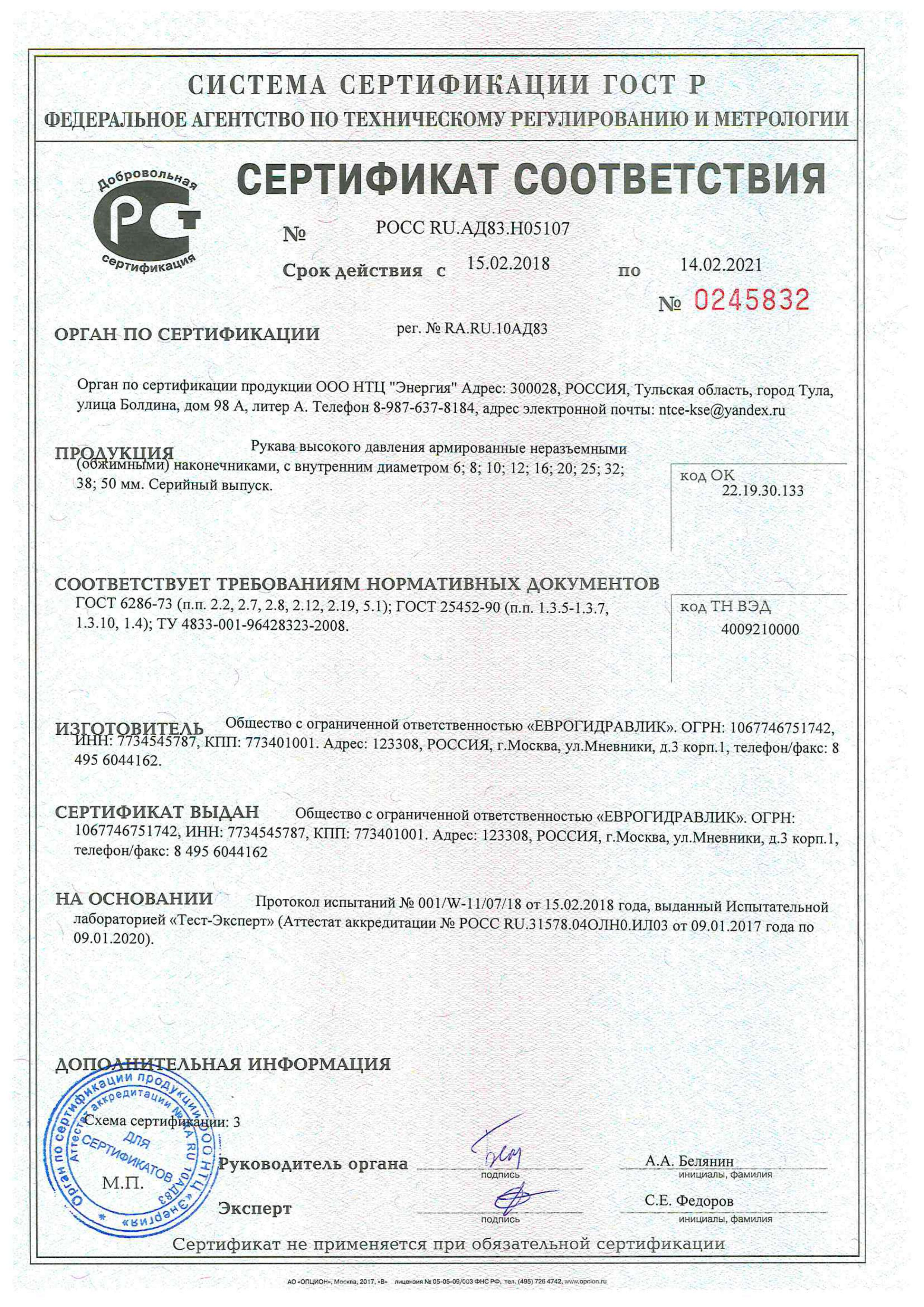 Данное свидетельство подтверждает, что все рукава высокого давления, произведенные компанией «Еврогидравлик» в полной мере соответствует существующим техническим стандартам Российской Федерации.