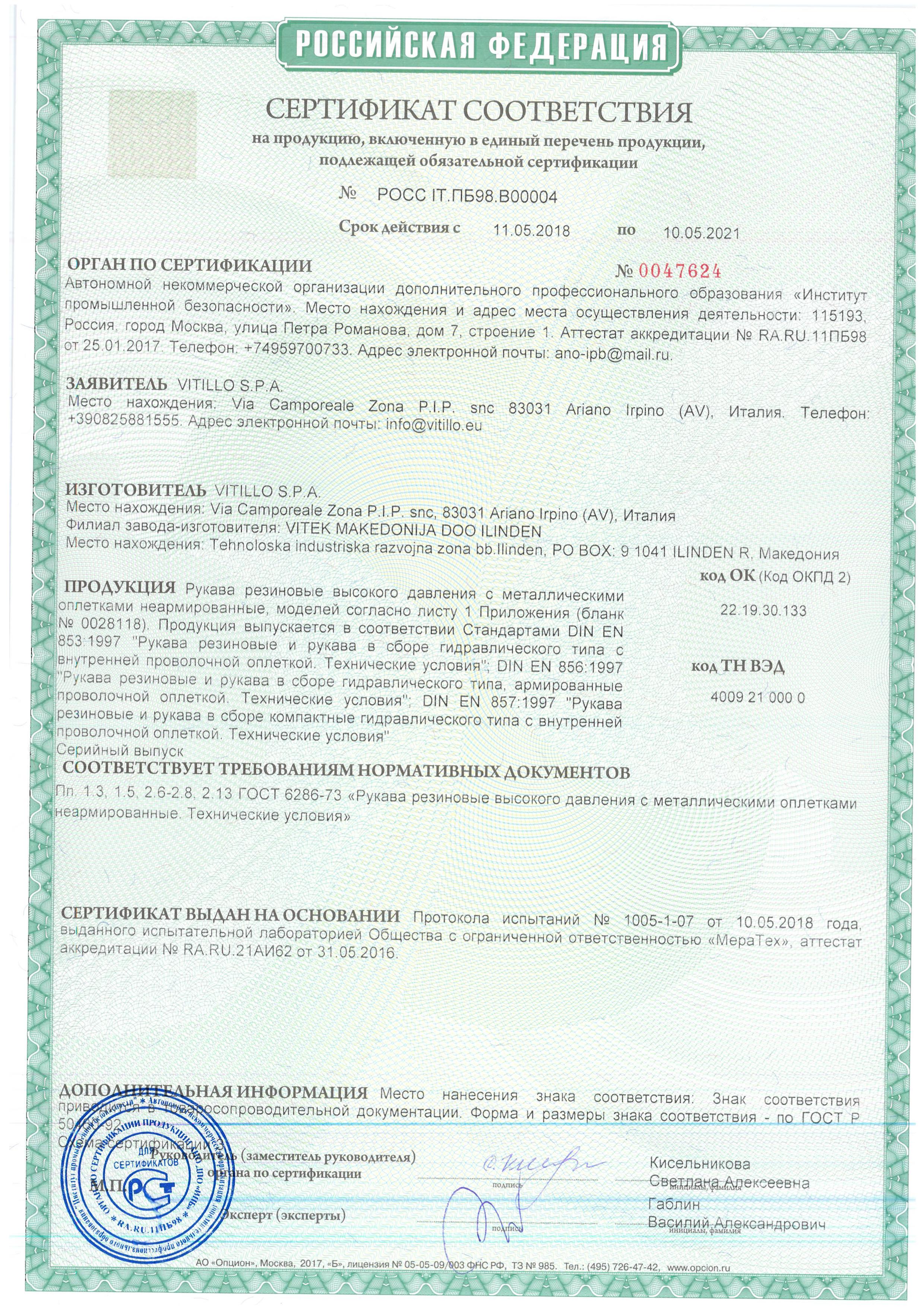 Данный сертификат выдан на линейку продукции бренда Vitillo (ранее Teknohose), который подтверждает, что представленные в компании изделия данного бренда соответствуют нормам и стандартам качества Российской Федерации.